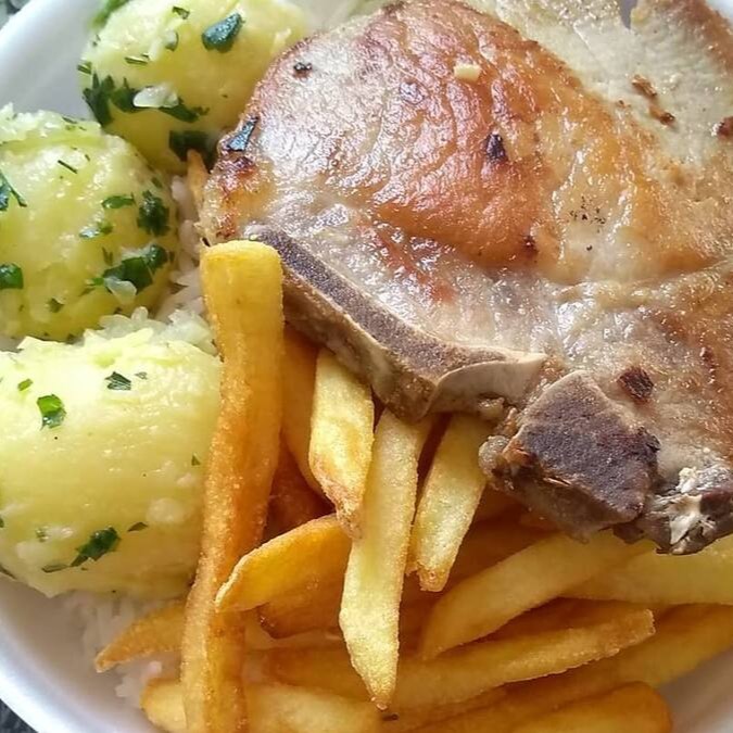 Acompanha salada de maionese, arroz branco, farofa e salada