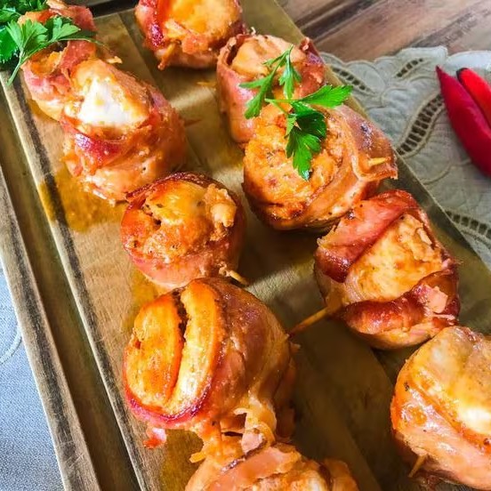 Medalhao de frango na brasa, Arroz, Feijão, salada mista, legumes e farofa.