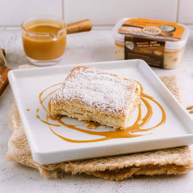Recheado com creme de coco e biscoito de leite, com cobertura de doce de leite.