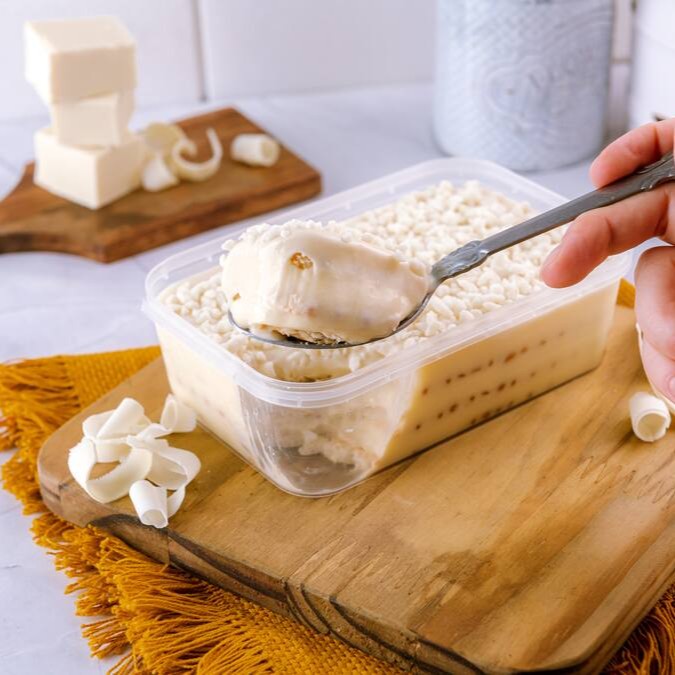 Recheado com creme branco e biscoito de leite, com cobertura de ganache de chocolate branco.