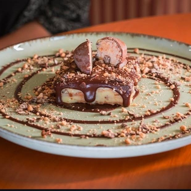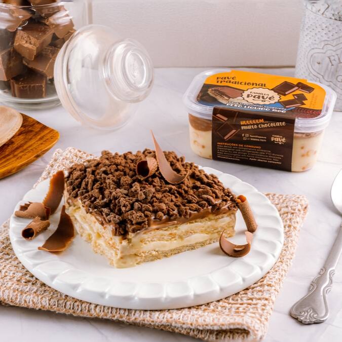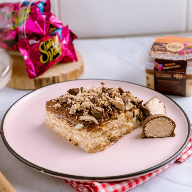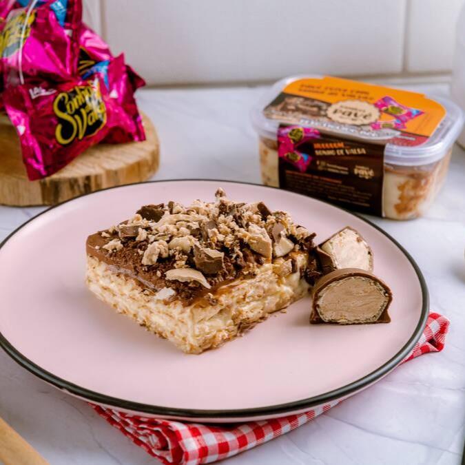 Pavê recheado com um delicioso creme branco e biscoito de leite bem molhadinho, com cobertura de ganache de chocolate meio amargo e o verdadeiro Sonho de Valsa triturado por cima.