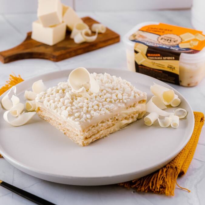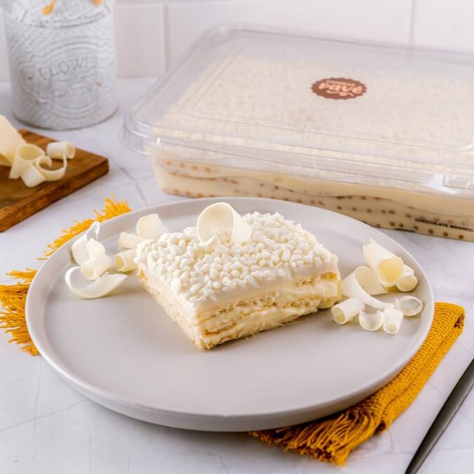 Pavê recheado com um delicioso creme branco e biscoito de leite bem molhadinho, com cobertura de ganache de chocolate branco e raspas de chocolate branco por cima.