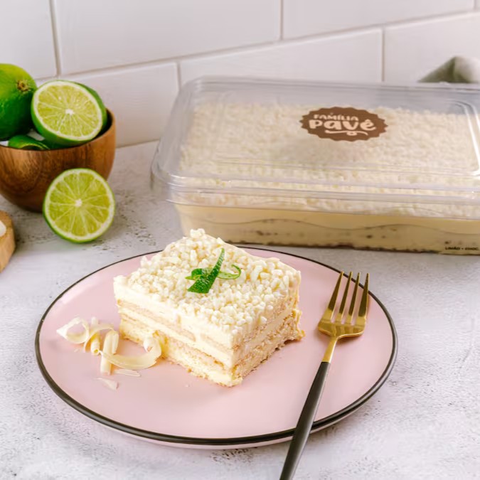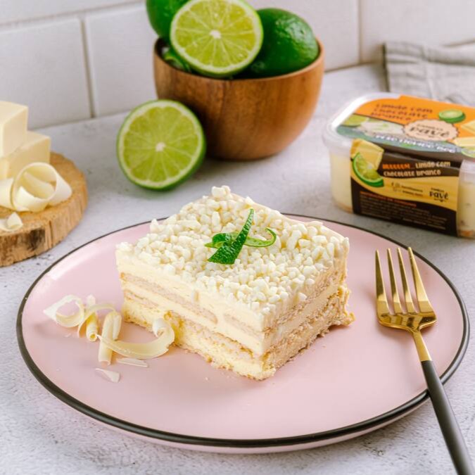Pavê recheado com um delicioso creme de limão e biscoito de leite bem molhadinho, com cobertura de ganache de chocolate branco e raspas de chocolate branco por cima.