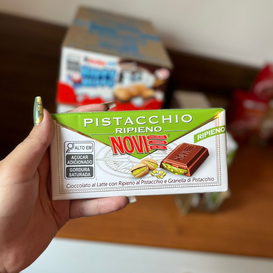 Chocolate Recheado com Creme de Pistache Produzido na Itália, o Novi Pistacchio Ripieno une o chocolate ao leite de textura aveludada a um recheio cremoso de pistache, criando um equilíbrio elegante entre doçura e intensidade. A tradição e o cuidado da Novi se refletem em cada detalhe desta barra de 105 g, que oferece uma combinação refinada e marcante para quem aprecia sabores autênticos e harmoniosos