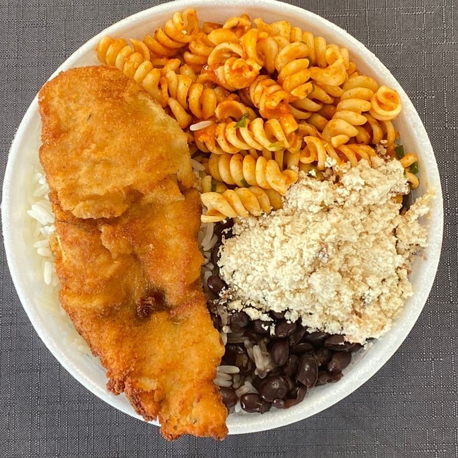 Marmita com Frango Empanado + Arroz + Feijão + Macarrão + Farofa Marmita de 550 ml*