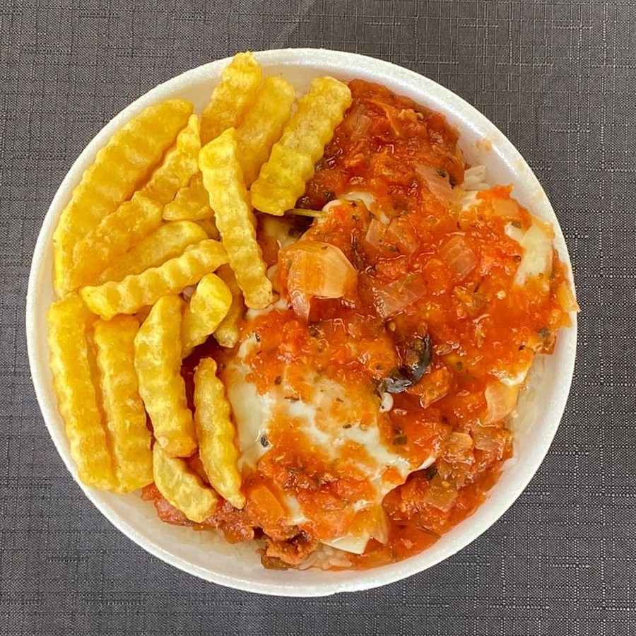 Marmita com Filé de Frango á parmegiana, arroz, e batata frita Marmita de 550 ml*