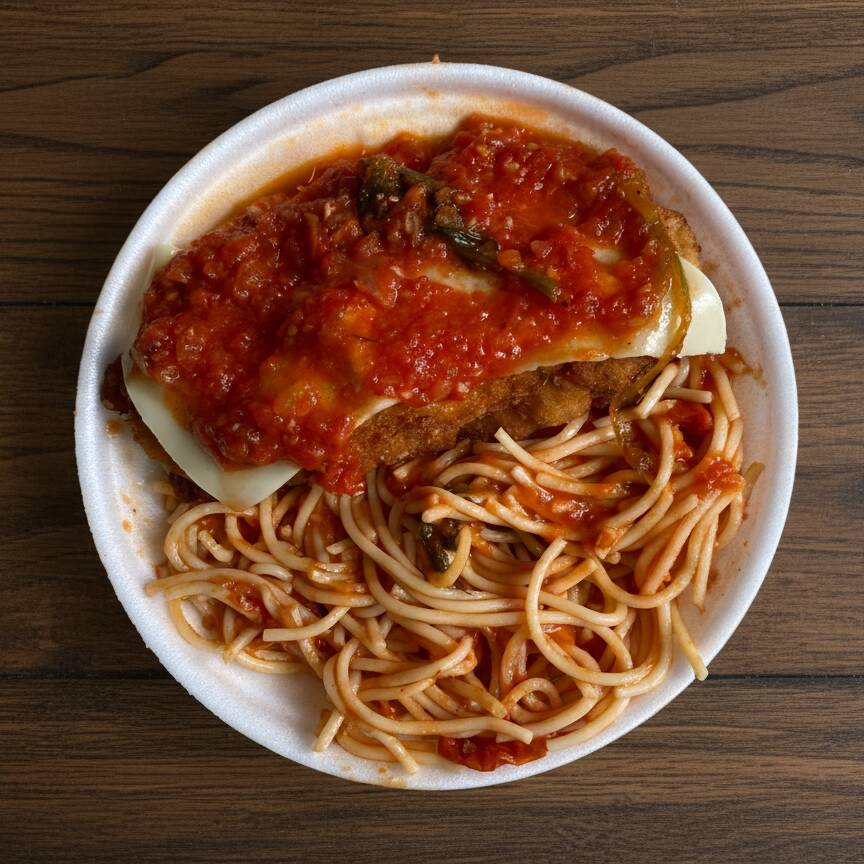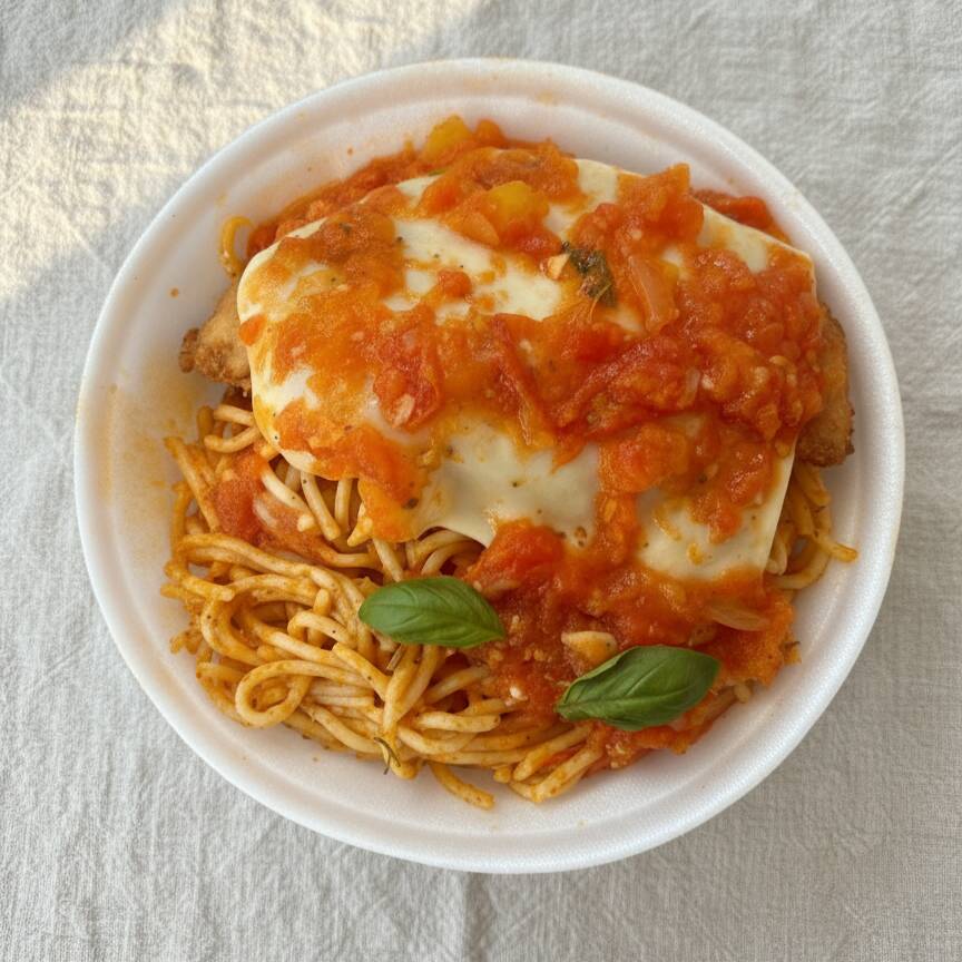Marmita P 550ml com: Macarrão Espaguete ao molho Pomodoro com Parmegiana de Frango (aproximadamente 450g)