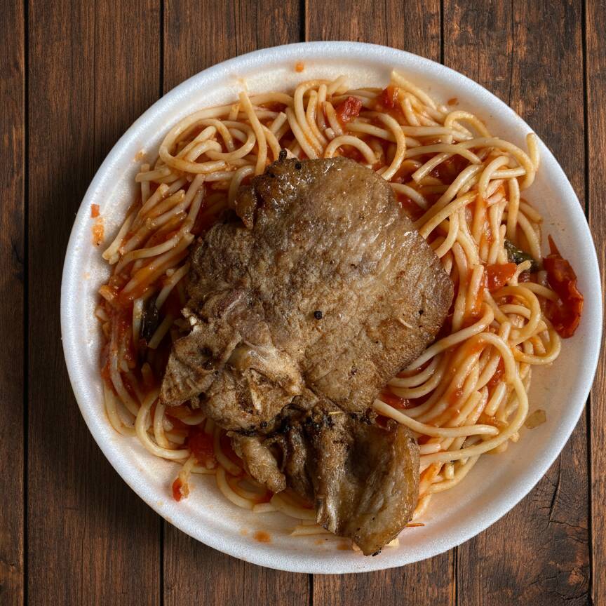 Marmita P 550ml com: Macarrão Espaguete ao molho Pomodoro & Bisteca Grelhada (aproximadamente 450g)