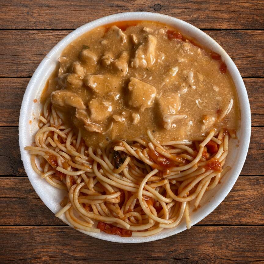 Marmita P 550ml com: Macarrão Espaguete ao molho Pomodoro & Strogonoff de Frango (aproximadamente 450g)
