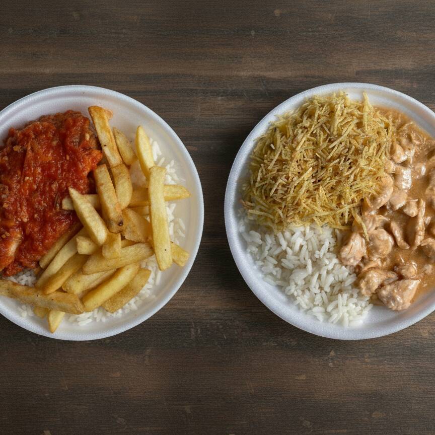 Marmita com Strogonoff de frango + Arroz e Batata Palha Marmita de 550 ml*