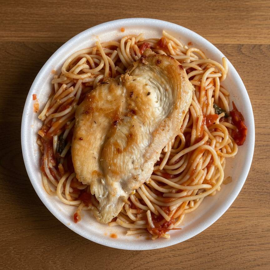 Marmita P 550ml com: Macarrão Espaguete ao molho Pomodoro & Frango Grelhado (aproximadamente 450g)