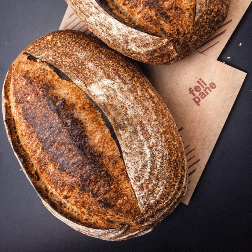 Sour, campanha, tipo um pão italiano... É como a gente explica ele aqui no balcão. Feito apenas com levain (fermento natural), 75% de farinha branca, 5% farinha de centeio e 20% integral. (650g aproximadamente)