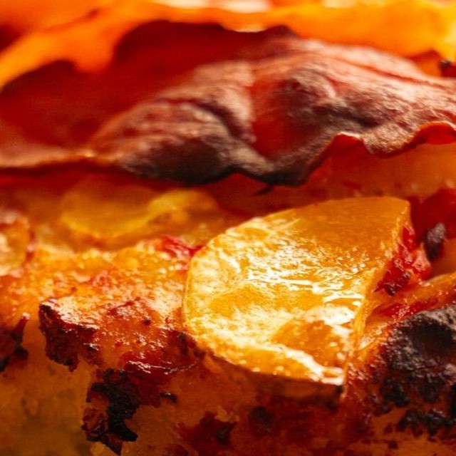 Fatia da nossa focaccia - massa fermentação natural com azeite - assada com molho de tomate, batata laminada fininha e fatias de bacon.