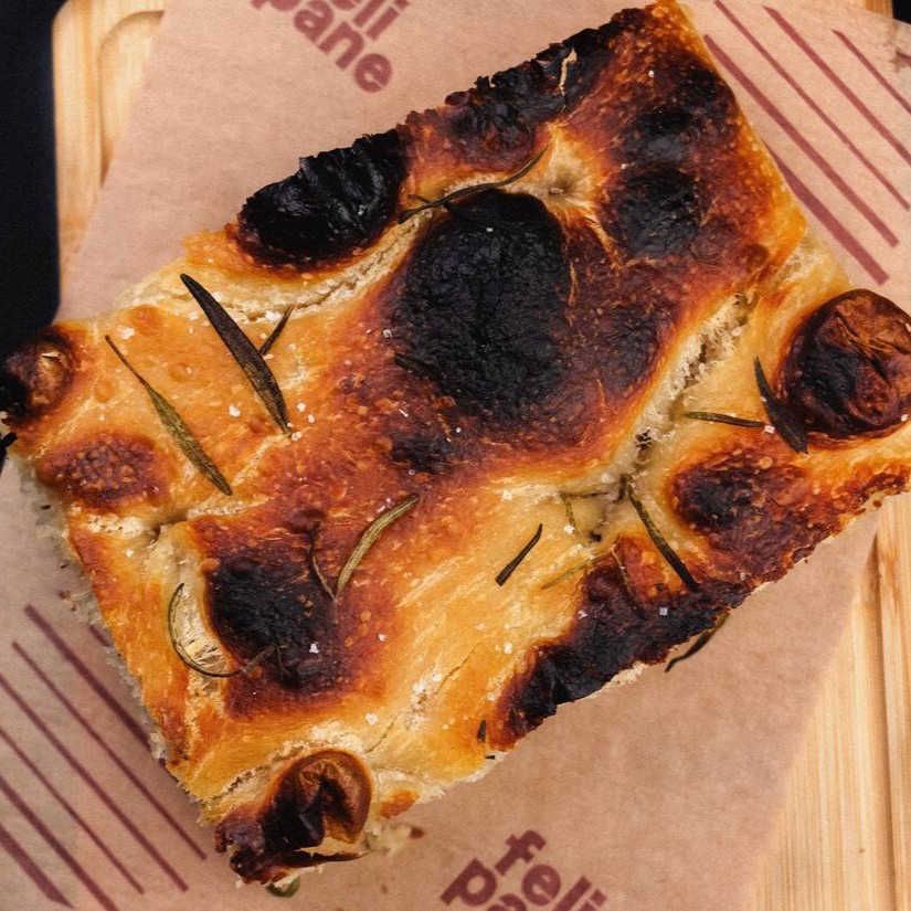 Fatia da nossa focaccia - massa fermentação natural com azeite - assada com alecrim fresco e finalizada com flor de sal