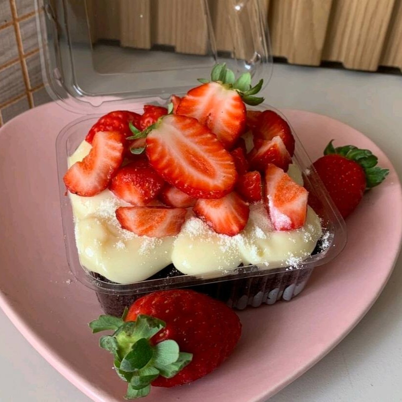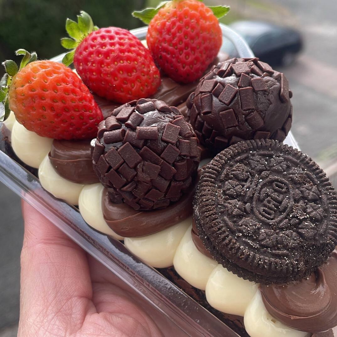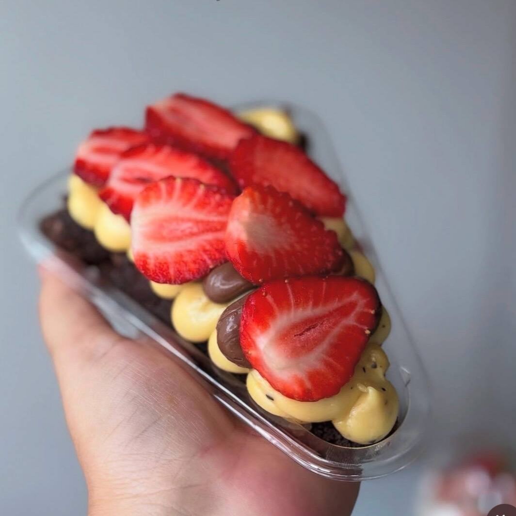 Uma deliciosa fatia de Brownie com coberturas q vc ama: Brigadeiro de Ninho, Nutella pura e fatias de morangos frescos. Uma combinação perfeita ———————————————-fatia Brownie, brownie, morango, Nutella, cupom, frete grátis, desconto, promoção, entrega