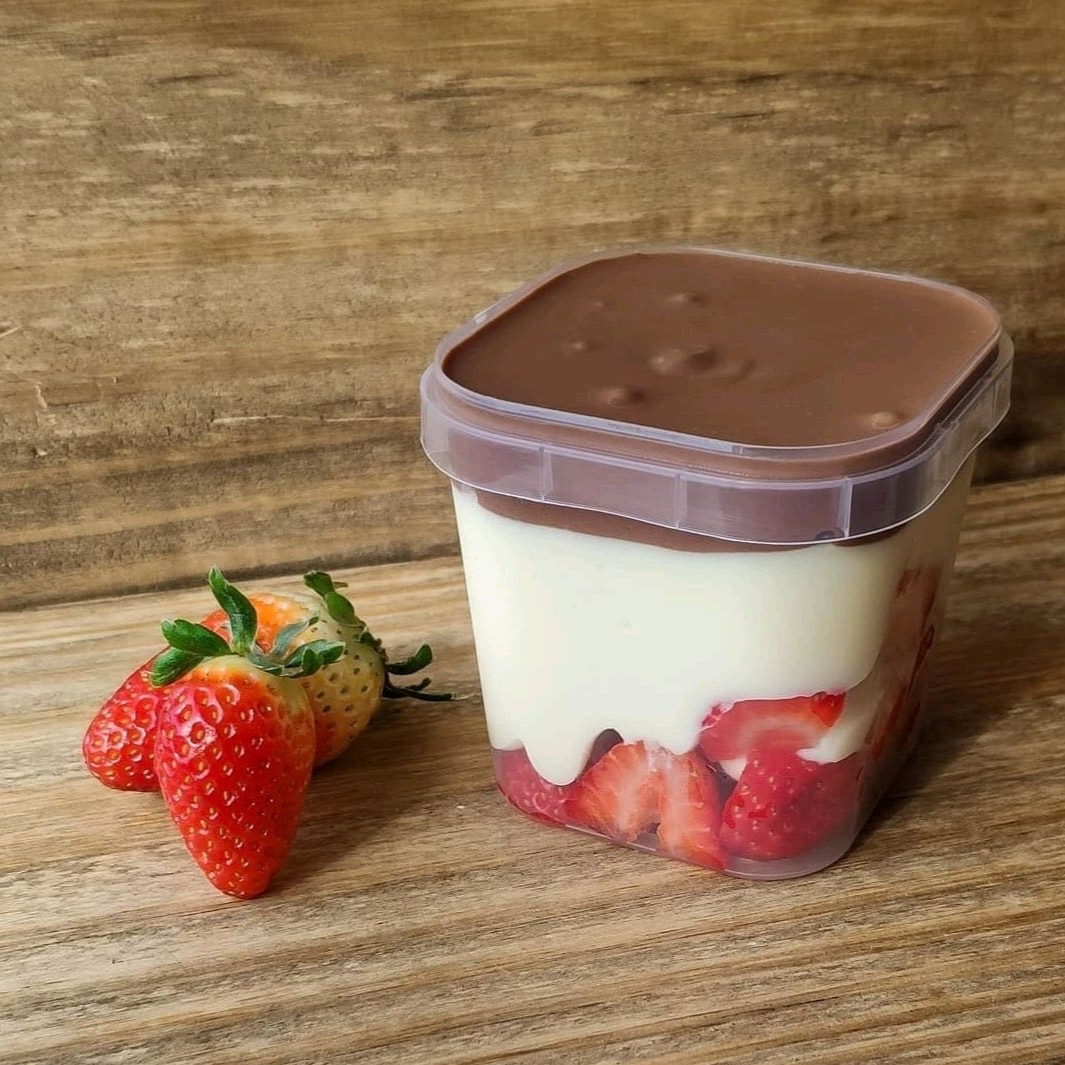 Pote de 220 ml Brigadeiro Branco com pedaços de morango, finalizado com Brigadeiro 50% cacau.
