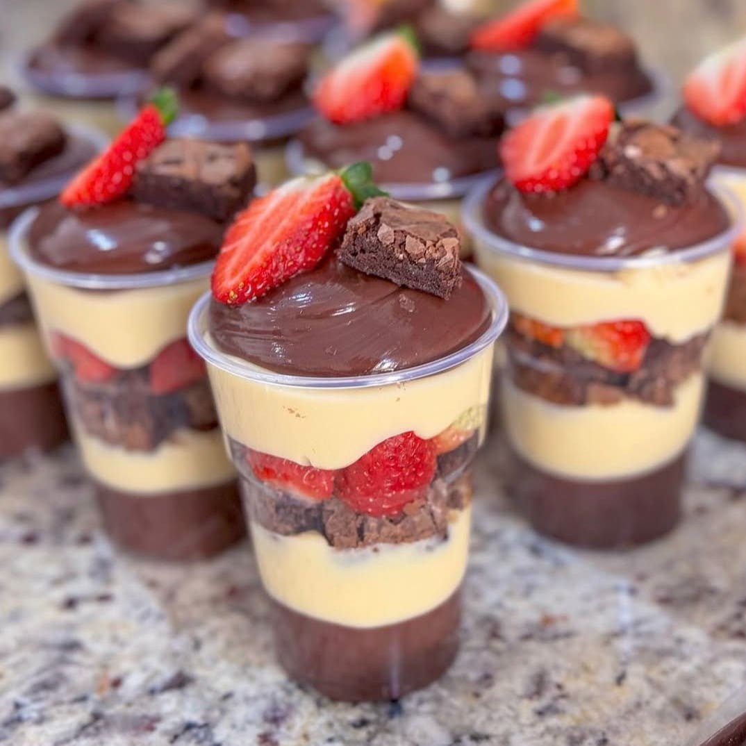 Copo da Felicidade 200ml – Brigadeiro Meio Amargo, Brigadeiro Branco, Morangos e Brownie. Um copo recheado de sabor e indulgência! Camadas de brigadeiro 50% cacau e brigadeiro branco cremoso, intercaladas com pedaços suculentos de morango e pedaços de brownie macio com nozes.Uma combinação perfeita para quem ama doces com equilíbrio e intensidade. Obs: os docinhos são apenas cortesia (não é obrigatório acompanhar