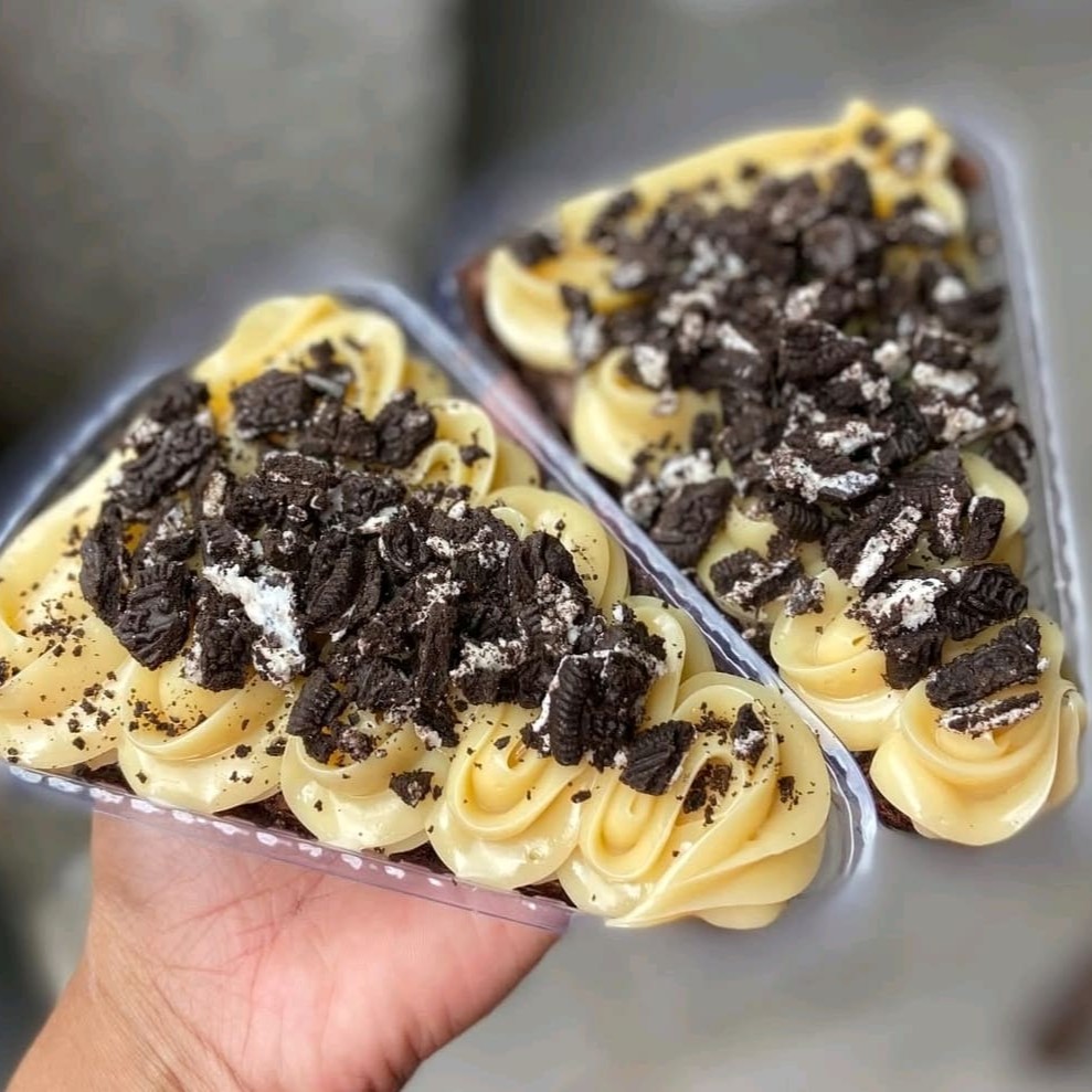 Uma Fatia de Brownie com Brigadeiro Branco de Ninho e Biscoito Oreo. Deliciosa fatia de brownie com textura macia, coberta com um cremoso brigadeiro branco de leite Ninho e finalizada com pedaços de biscoito Oreo. Uma explosão de sabores para os amantes de doces!