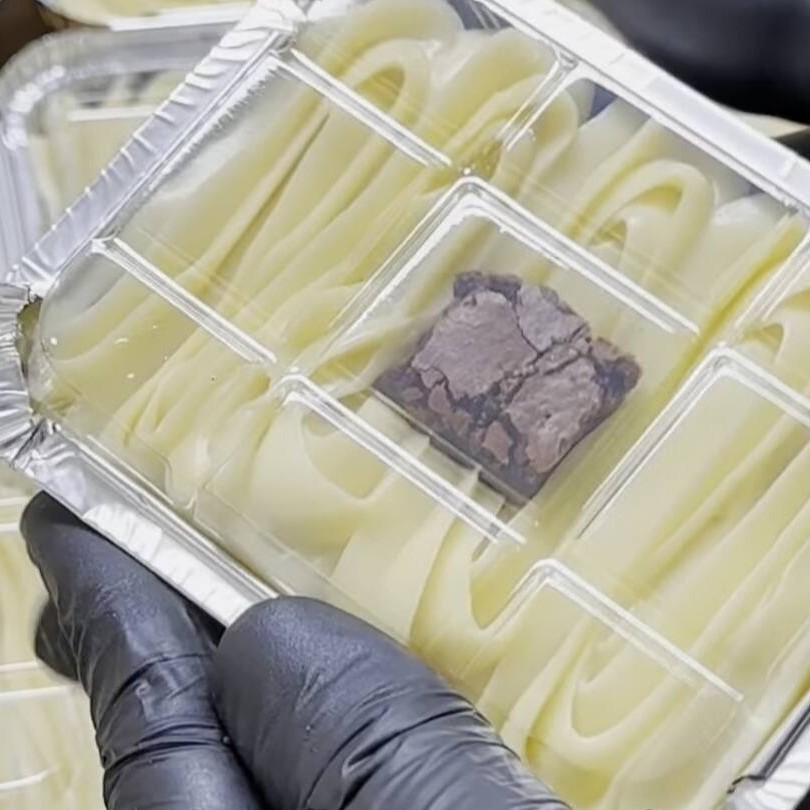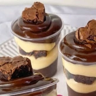 Marmitinha de 220ml Recheios: Brigadeiro 50% cacau, pedaços de Brownie com nozes, finalizado com Brigadeiro Branco.