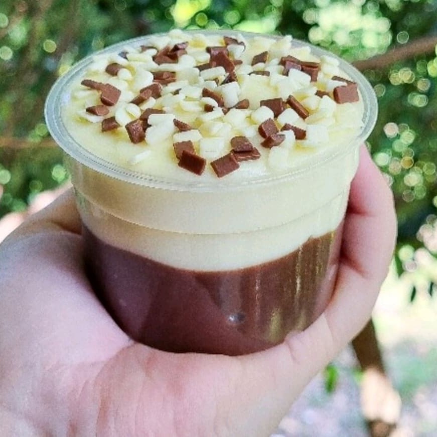Um Copo de 200ml recheado com Brigadeiro Branco e Brigadeiro Tradicional 50% cacau com pedaços de Brownie e Uvas sem sementes. Obs: acompanha docinho de cortesia ( não é obrigatório)