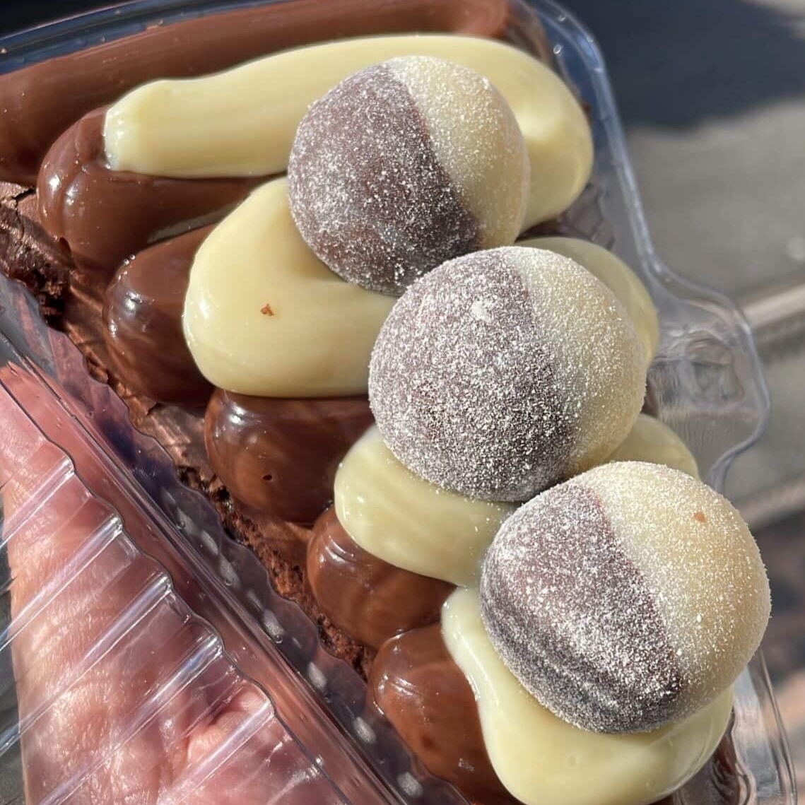 Brownie Dois Amores Uma explosão de sabor em cada mordida! Nossa fatia de brownie leva uma base densa e chocolatuda, coberta com uma generosa camada de brigadeiro branco cremoso e brigadeiro meio amargo 50% cacau, que juntos criam o equilíbrio perfeito entre o doce e o intenso. Perfeito para quem ama sentir o contraste dos dois mundos em um só pedaço!