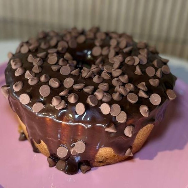 Massa de baunilha com gostas de chocolate na massa, cobertura de ganache caseira e gotas de chocolate.