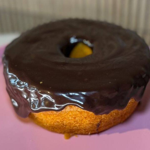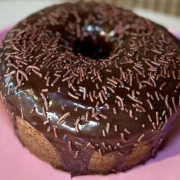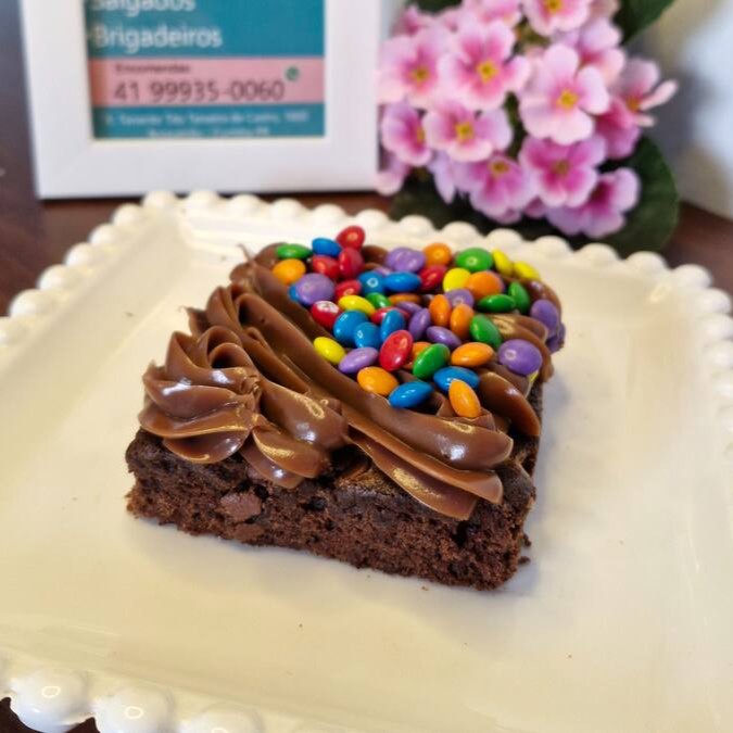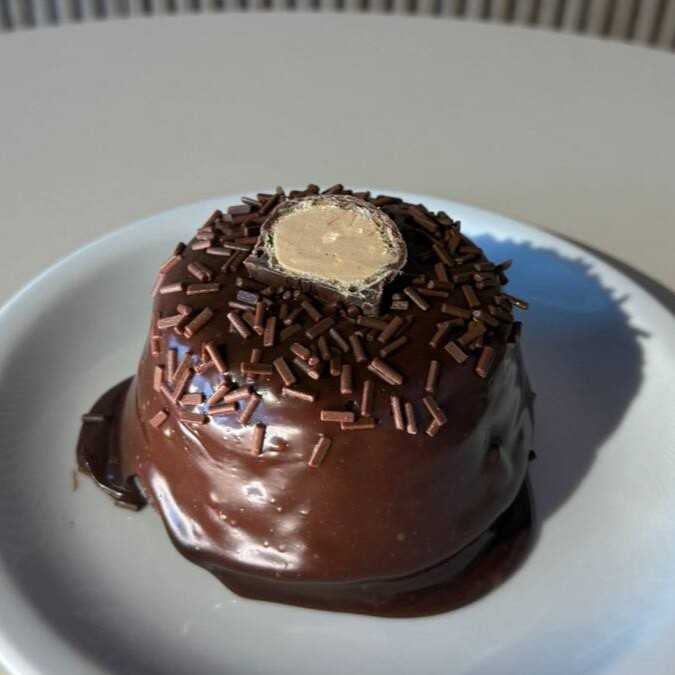 Massa amanteigada de chocolate, super macio, cobertura calda de chocolate caseira e granulado.