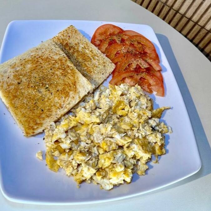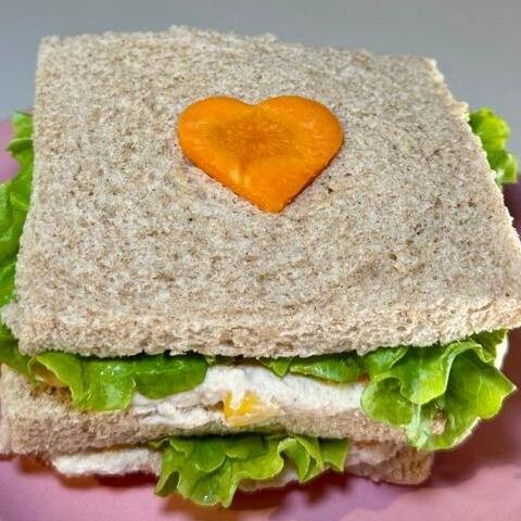 Pão de forma macio e sem casca integral, recheado com patê de frango desfiado, cenoura ralada e alface.