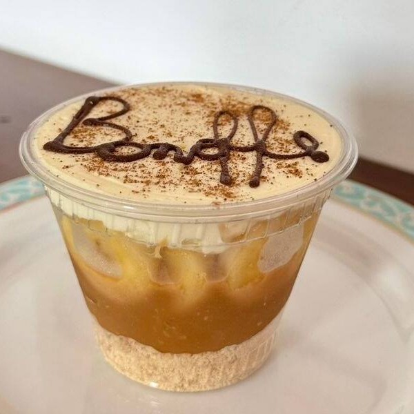 Deliciosa Sobremesa, com farofinha de biscoito, doce de leite caseiro cremoso, banana, creme belga ( à base de nata) e canela.