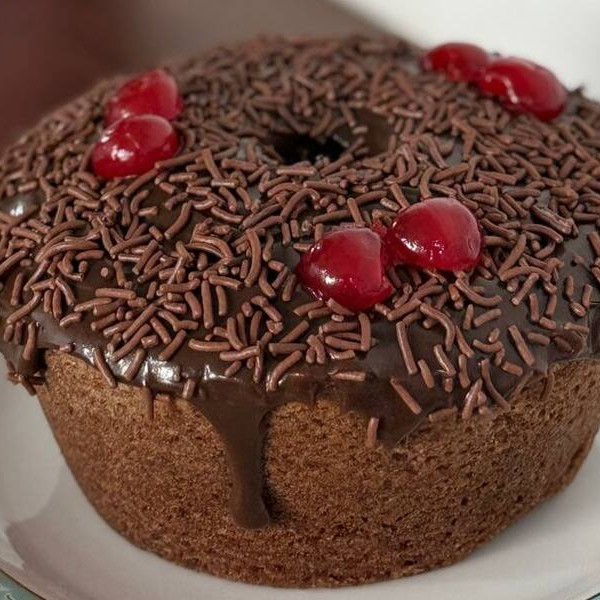 Massa de chocolate amanteigada com cereja em pedaços, cobertura calda de chocolate artesanal, granulado e cereja na decoração.