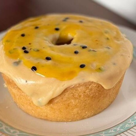 Massa amateigada com iogurte natural, pasta saborizante de maracujá, cobertura de mousse de maracujá acompanhada de geléia de maracujá.