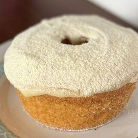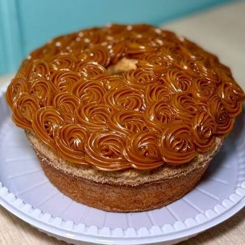 Massa amanteigada com iogurte natural, com um toque suave de açucar e canela, cobertura de doce de leite cremoso.