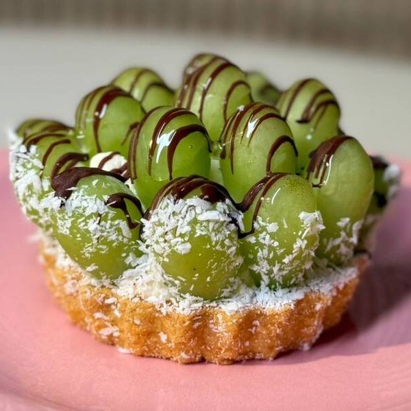 Massa patê sucrée, doce de leite, creme belga, uvas, geléia de brilho e risca de chocolate.