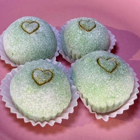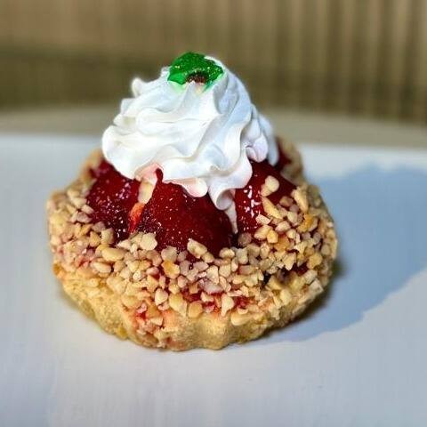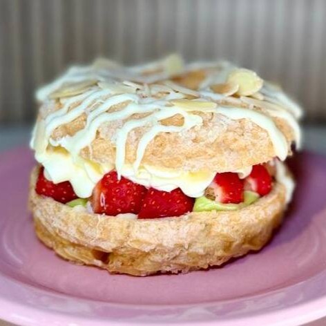 Massa Choux, brigadeiro cremoso de pistache, nata cremosa com leite condensado, morangos picados, finalizado com lâminas de amêndoas.