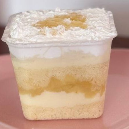 Massa amanteigada de baunilha, abacaxi em calda caseiro, cocada cremosa e creme chifon como base, cobertura chantilly e abacaxi.