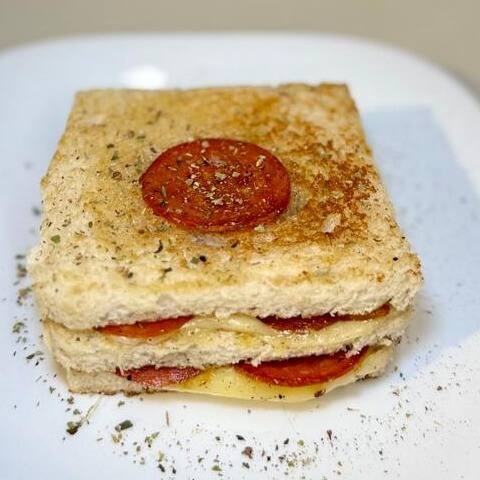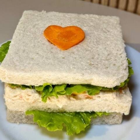 Pão de forma macio e sem casca branco, recheado com patê de frango desfiado, cenoura ralada e alface.