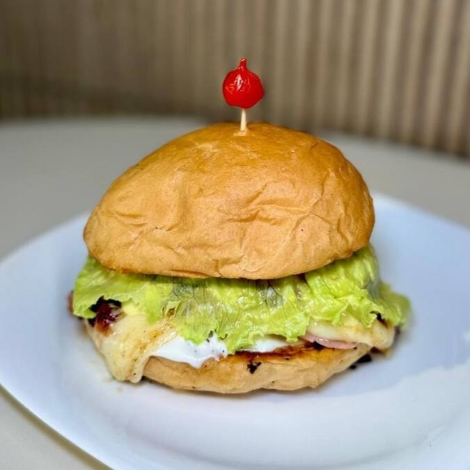 Pão de Hambúrguer, hambúrguer artesanal, queijo, presunto, bacon picado, ovo, tomate, alface, molho especial.