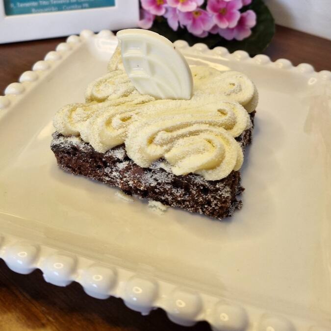 Massa de chocolate, strogonoff de nozes cremoso, ameixa cozida, bába de moça e nata, cobertura chantilly e ameixa.