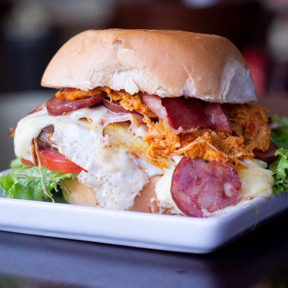 Pão de hamburgue,hamburguer,frango desfiado,bacon,ovo,calabresa,alface,tomate,queijo,presunto e maionese