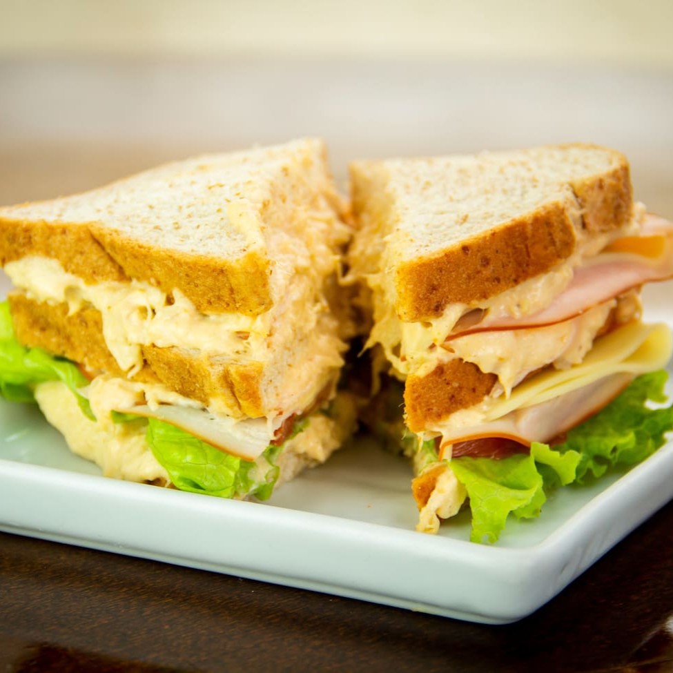 Pão integral,pate de frango,alface e tomate,peito de peru e queijo
