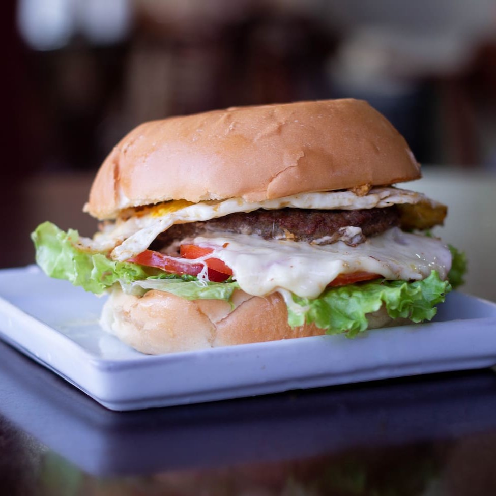 Pão de hamburguer, hamburguer,ovo,queijo,presunto,alface,tomate e maionese