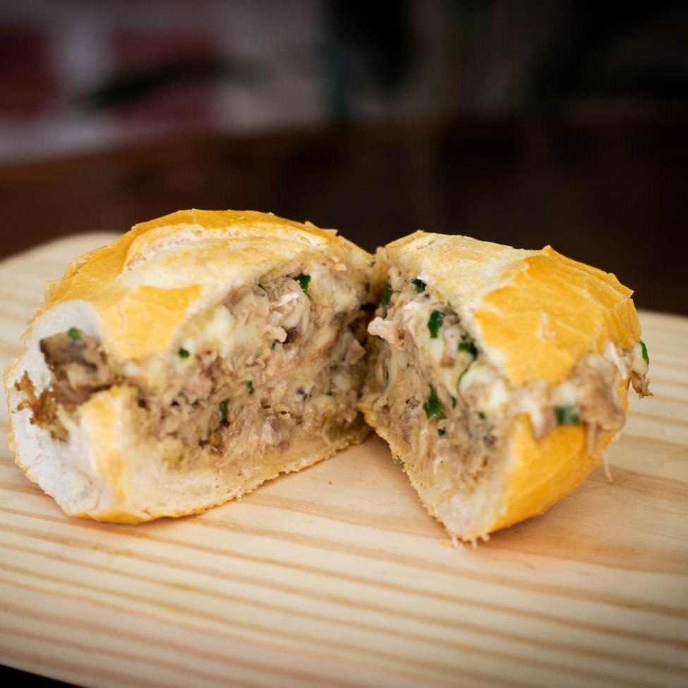 Pão frances,maionese,pernil desfiado,queijo e cebolinha