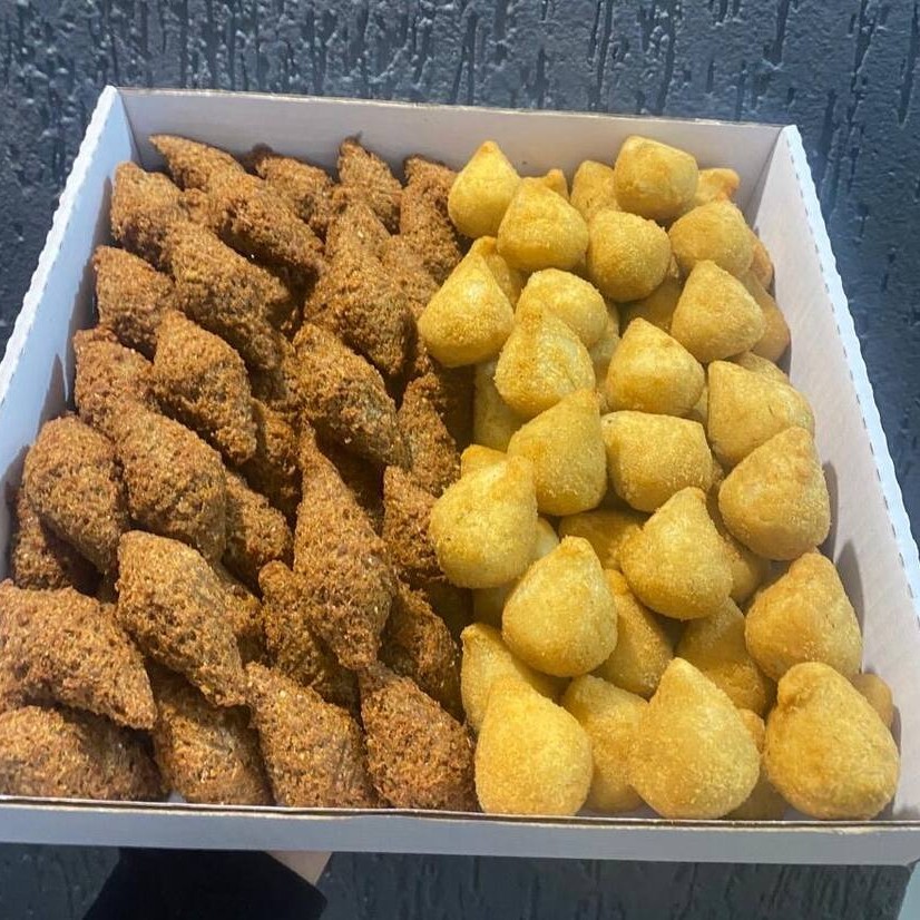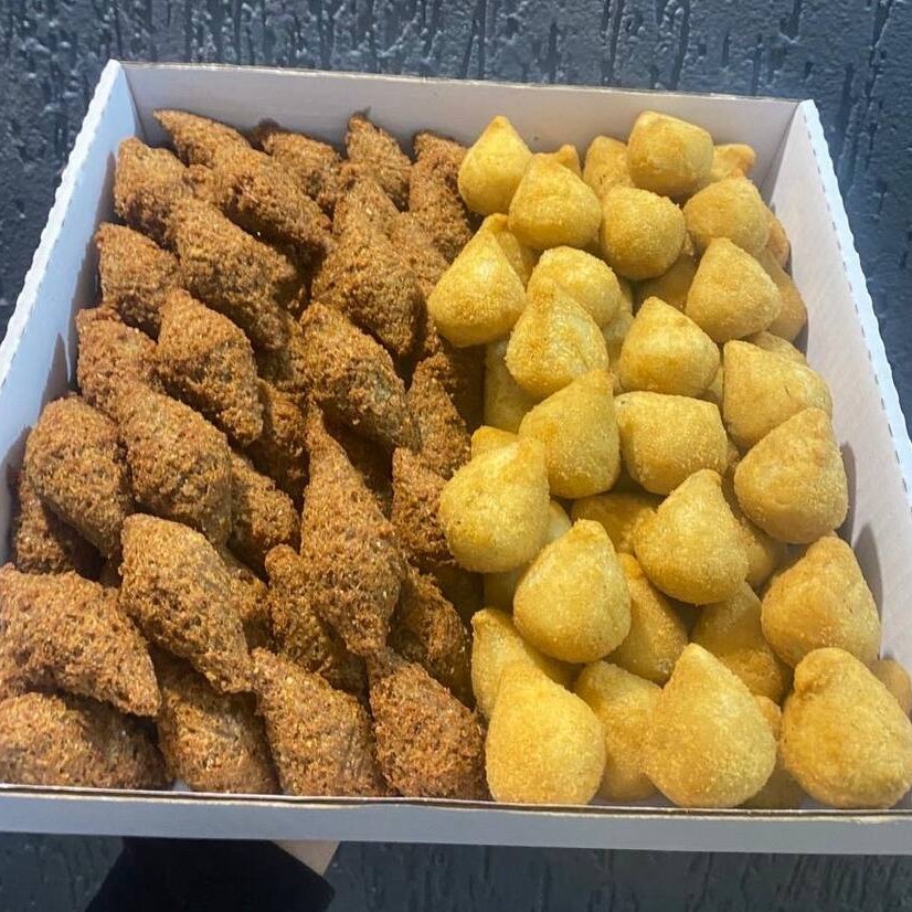 50 salgados saborosos, com aproximadamente 23gr. Nossos salgados são fritos na hora, e é possível escolher até 2 sabores!