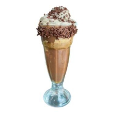 Sorvete de creme, café expresso, biscoito triturado, calda de chocolate e chantilly