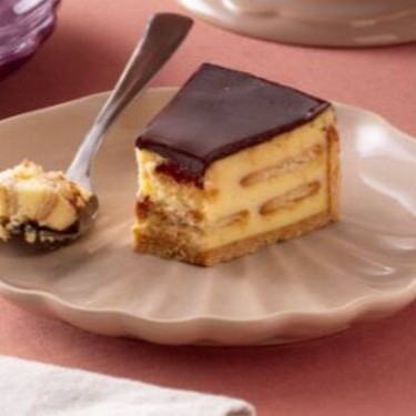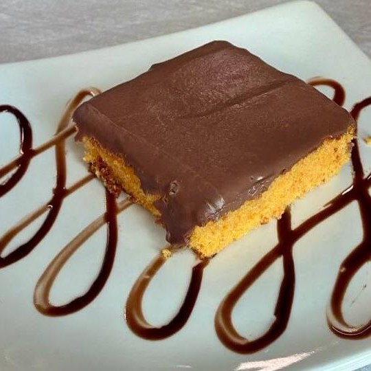 Torta a base biscoito maizena e creme de leite com manteiga, coberta com chocolate meio amargo.