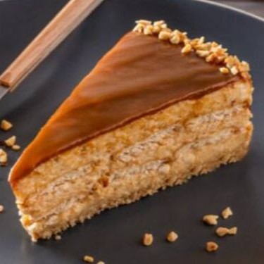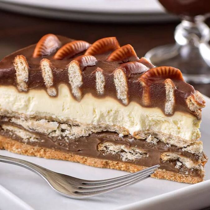 Torta à base de biscoito e creme de amendoim coberta com doce de leite e decorada com amendoim crocante.