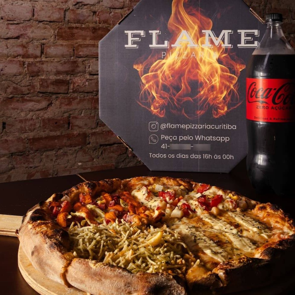 Dupla de sabores, dobro de prazer! “Dois sabores, o dobro de prazer!” Monte sua pizza grande (8 fatias) com 2 sabores irresistíveis Flame. Massa leve, borda crocante e muito recheio em cada pedaço.