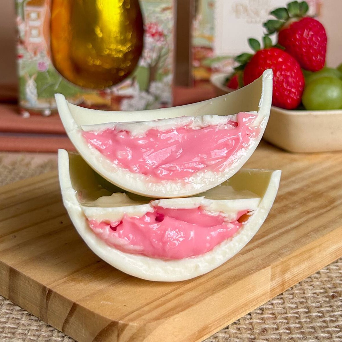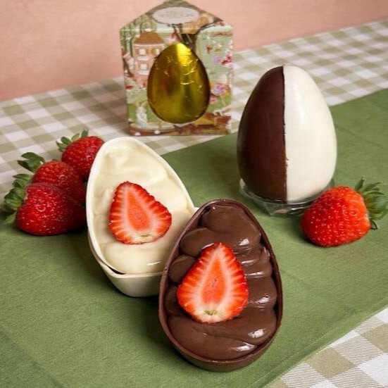Ovo de colher; feito com chocolate meio amargo, recheado com duas camadas de brigadeiro 50% cacau, feito com chocolate nobre Sicao e uma camada de morangos picados no meio;