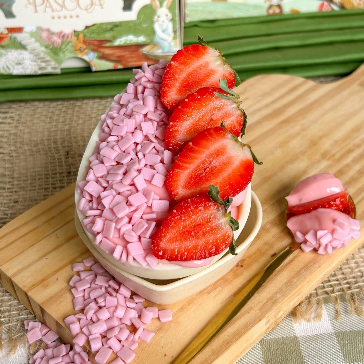 Ovo de colher; feito com chocolate branco, recheado com, duas camadas de brigadeiro de Nesquik, e morangos picados;