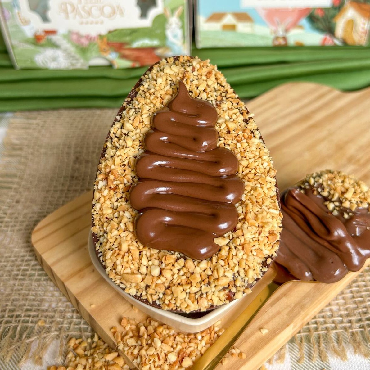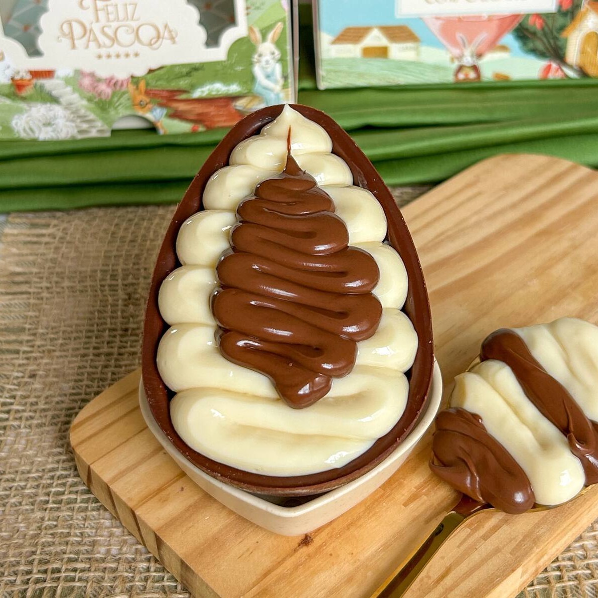 Ovo de colher; feito com chocolate meio amargo, recheado com duas camadas de brigadeiro de Leite Ninho e Nutella pura no meio;